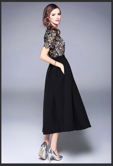レトロな花柄刺繍レースが個性的な、ロング丈パーティードレス。
