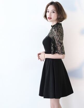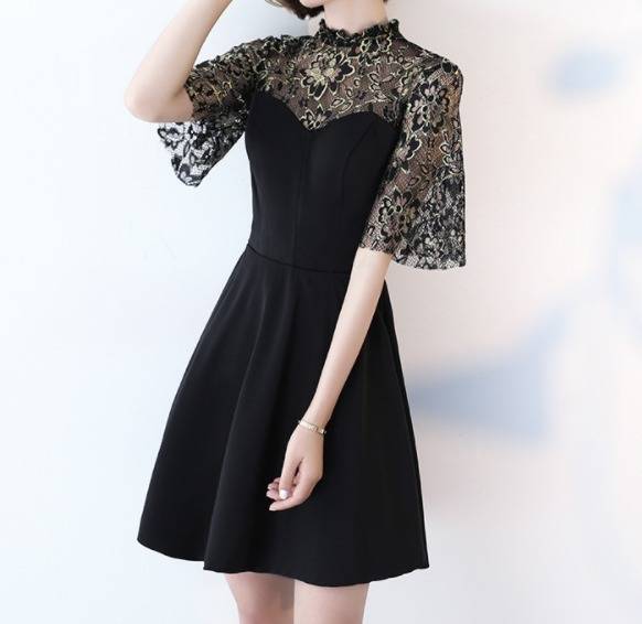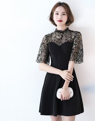 結婚式ドレス お呼ばれワンピース 20代 30代 40代 袖あり ひざ下丈 黒 刺繍 レース 5分丈