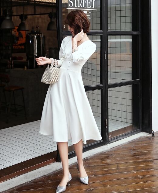 ホワイト ひざ上丈 ストレッチサテン パーティードレス iPd0044