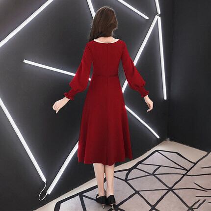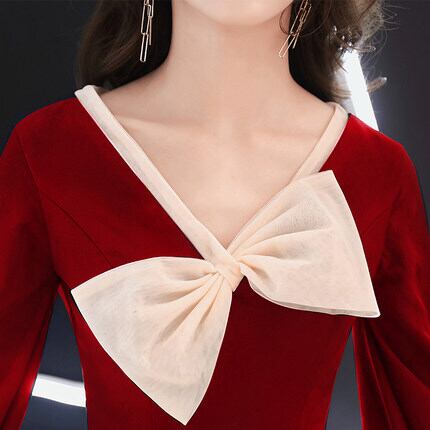 ワインレッド ひざ下丈 リボン パーティードレス ipd0235
